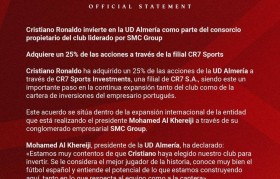 2月26日,西乙球队阿尔梅里亚队在官方宣布,C罗通过其公司CR7体育投资公司,收购球队25%股份。阿...