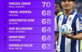 直播吧5月28日讯数据平台Squawka今日公布了本赛季西甲联赛被犯规次数榜,其中日本中场久保建英以...